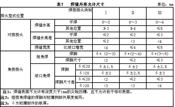 7.1.1焊缝边缘应圆滑过渡到母材,焊缝外形尺寸应符合设计要求,其允许尺寸见表7。